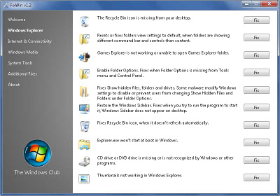 FixWin memiliki 7 fitur utama yaitu Welcome, Windows explorer, Internet and Connectivity, Windows Media, System Tools, Additional Fixes, dan About. Untuk menu Welcome pastikan anda selalu melakukan System File Checker Utility serta membuat system restore point. Pada menu Windows Explorer ada beberapa fungsi diantaranya adalah Fix Recicle bin icon is missing from desktop, Reset atau fix Folder view settings to default, folders and drives, enable folder options,Enable to game explorer folder, fix show hidden files,dll. Sedangkan Internet and Connectivity memiliki fungsi seperti fix internet option is missing, optimize internet explorer maximum connection, Fix run time error dialogs are appearing in internet explorer when surfing. dan untuk menu-menu yang lain silahkan dilihat lebih detail setelah mendownload software FixWin.
